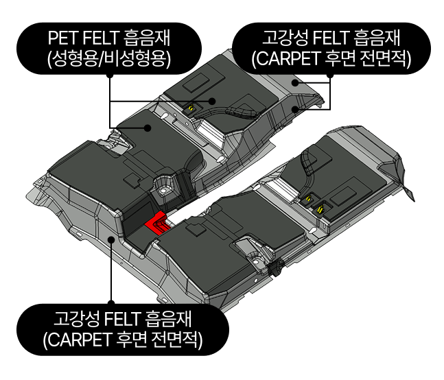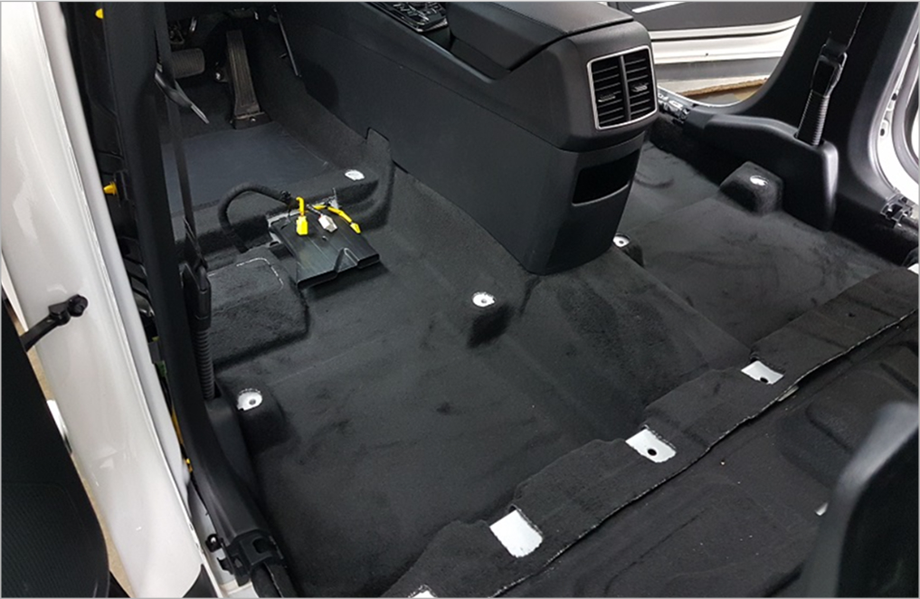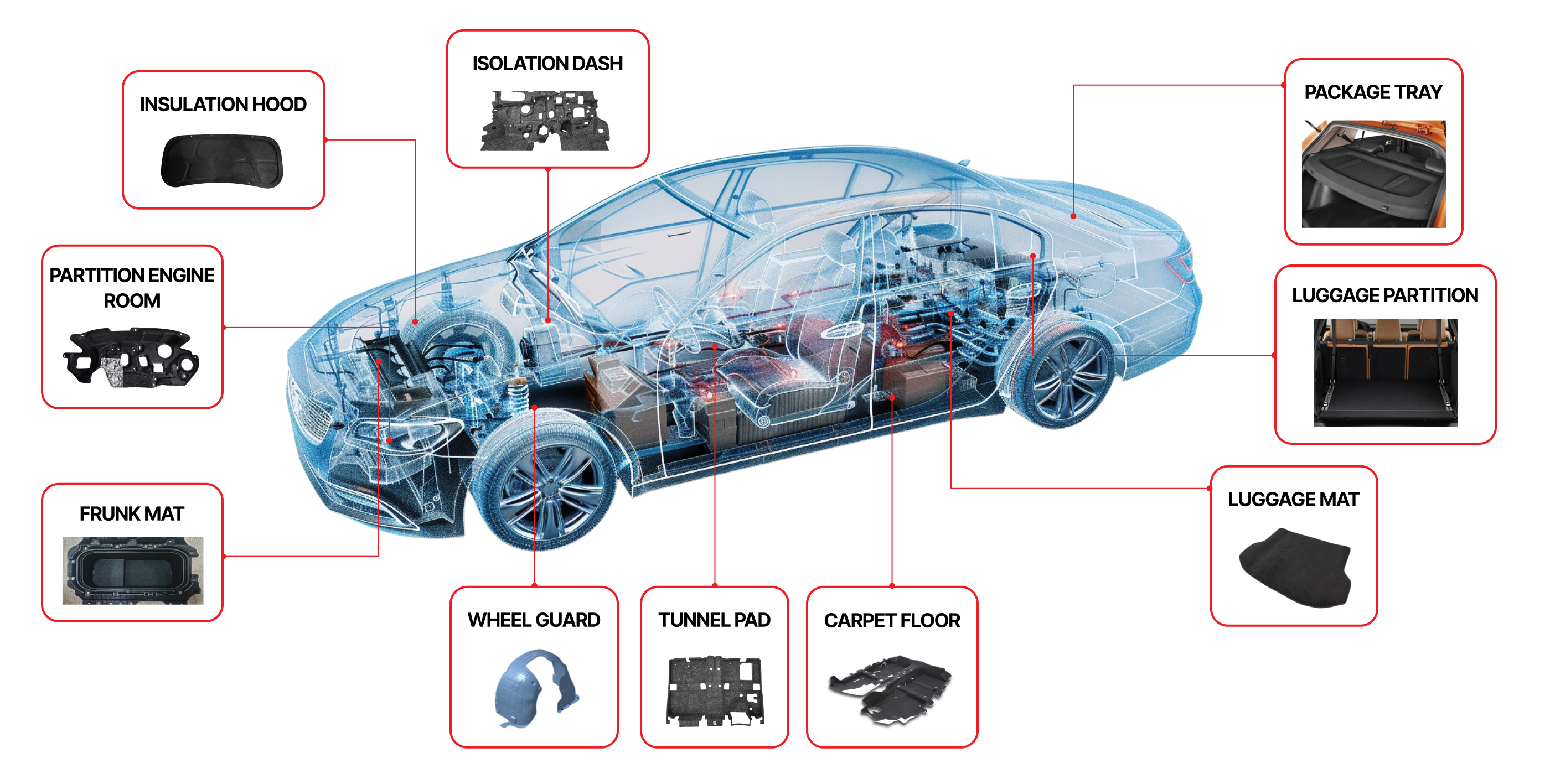 차량의 실내 바닥, 도어, 엔진룸, 천정, 트렁크 등 각 부위에 성형 또는 비성형품으로 광범위하게 적용