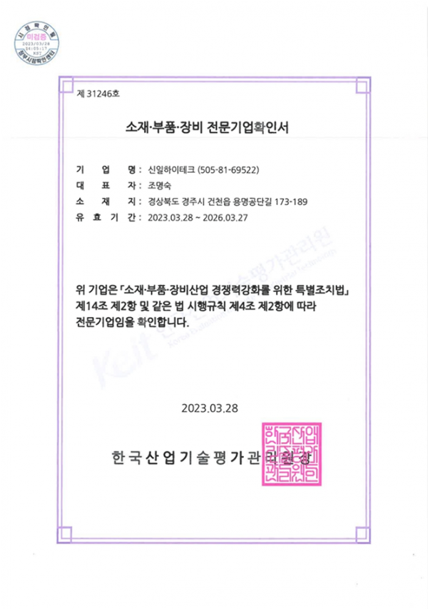 Patents & Expertise Certificate of Material, Parts, and Equipment Specialized Company